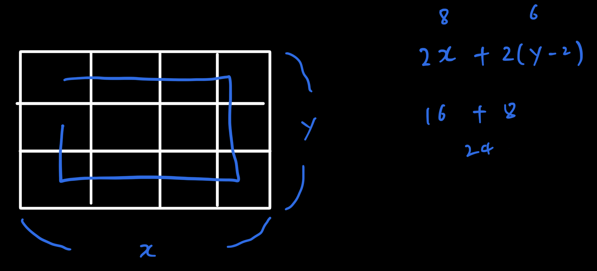 테두리 개수 구하는 방법은 위 그림과 같습니다. 2x를 하게되면 y-2의 오른쪽, 왼쪽 갯수가 남는것을 확인할 수 있습니다. 해당 식을 만족하면 최소한 "테두리"는 만족을 한다는 것을 알 수 있습니다. 이제 내부를 yellow로 가득 채워야합니다. 이는 (x-2) * (y-2) 가 yellow와 같을 때 만족함으로 해당 식 두개를 한번에 만족하면 답이 되는 것을 확인할 수 있습니다.